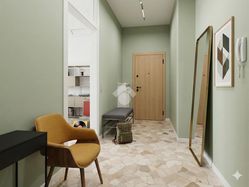 Il contesto condominiale è rifinito con intonaco e mattone a vista, conferendo un tocco elegante e moderno.