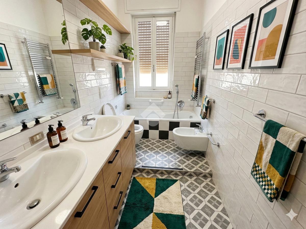 I bagni sono due, di cui uno servito sia dalla vasca che dalla doccia, garantiscono funzionalità e praticità, mentre la zona giorno si apre su una lunga balconata che abbraccia il soggiorno e la camera matrimoniale, offrendo una vista panoramica.