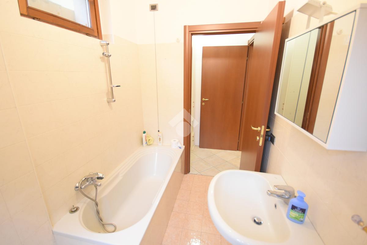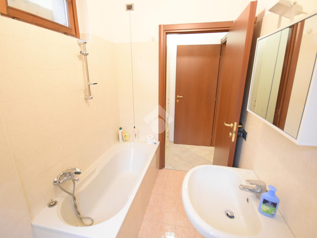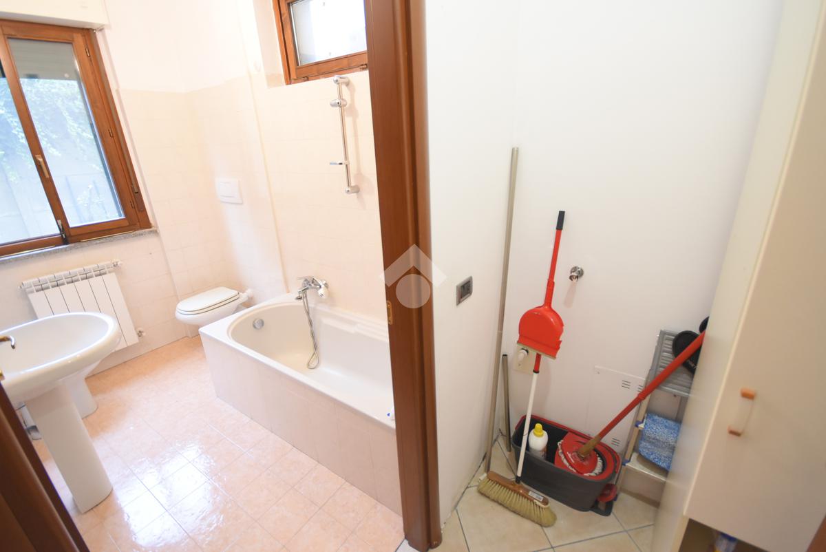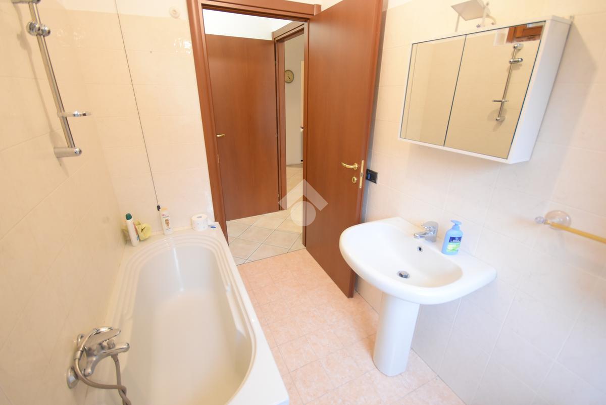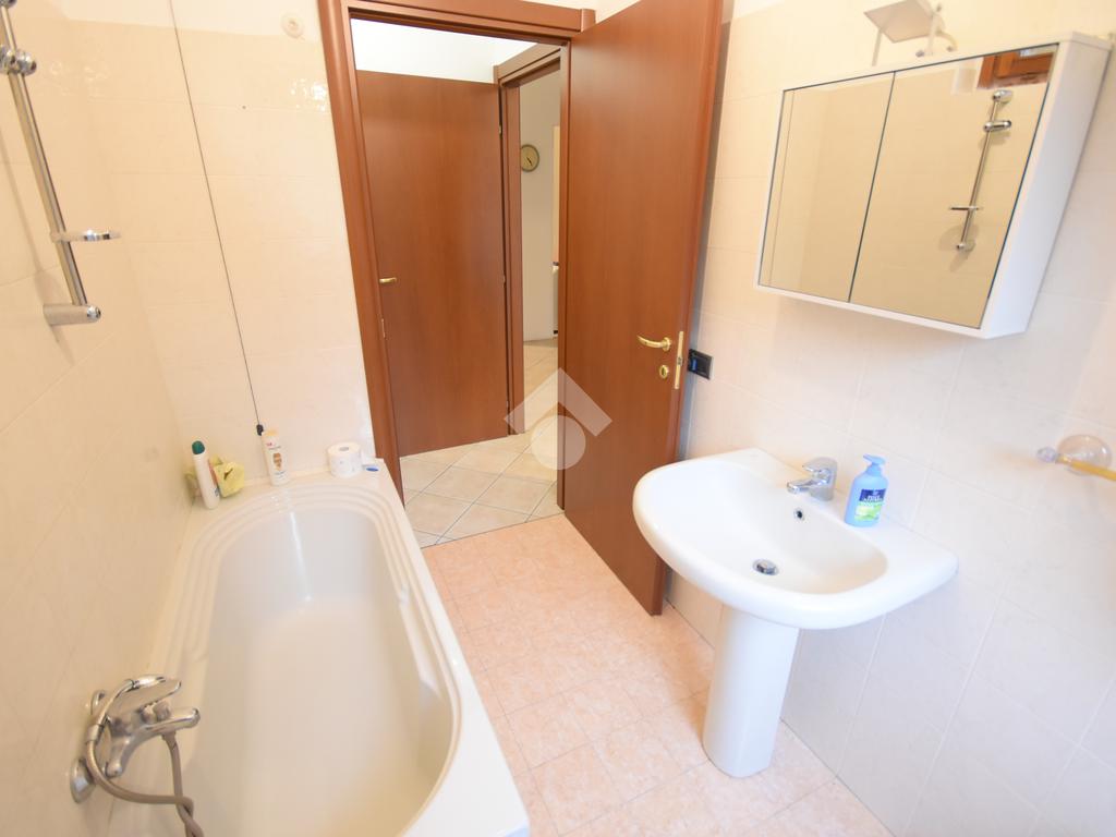 Un disimpegno, comodo e funzionale, ospita gli attacchi per la lavatrice e conduce a un bagno finestrato completo di vasca.