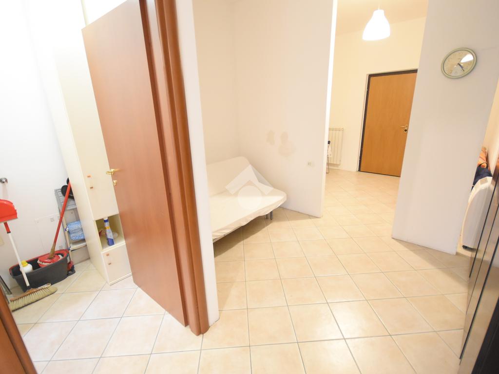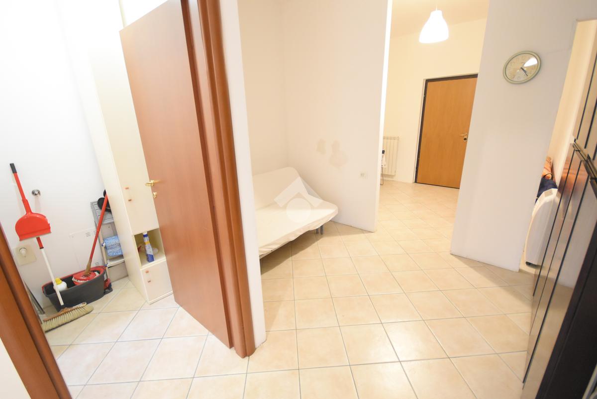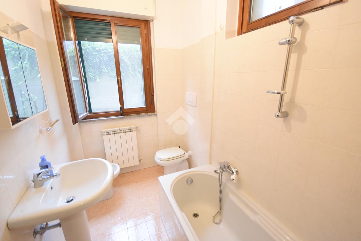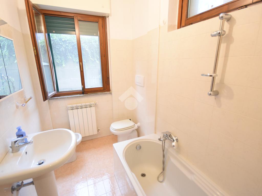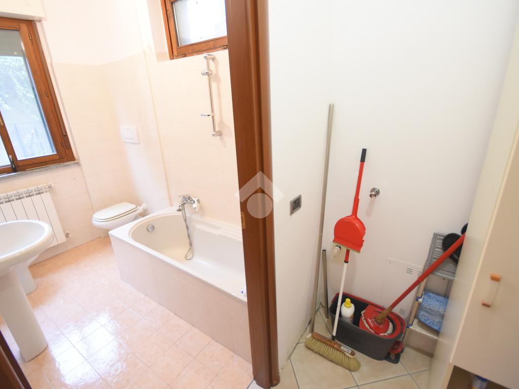 Un disimpegno, comodo e funzionale, ospita gli attacchi per la lavatrice e conduce a un bagno finestrato completo di vasca.