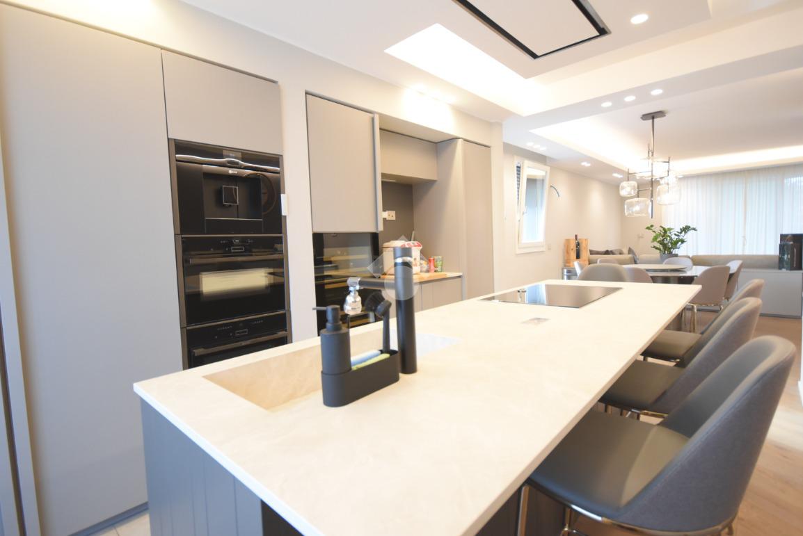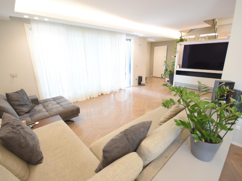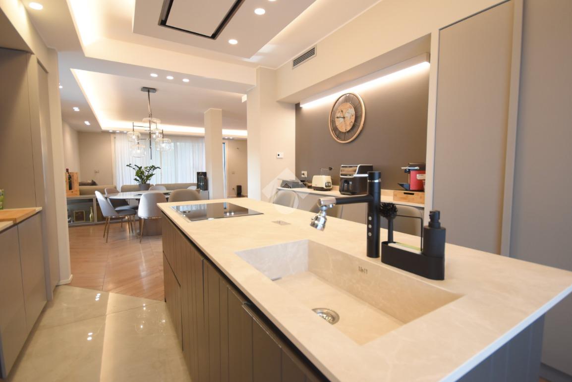 Al secondo piano si apre la scenografica zona living, luminosa e raffinata, dove la cucina a isola dialoga con l’esterno grazie a un’imponente vetrata a tutta altezza affacciata sul terrazzo principale di circa 30 mq, esposto a sud.