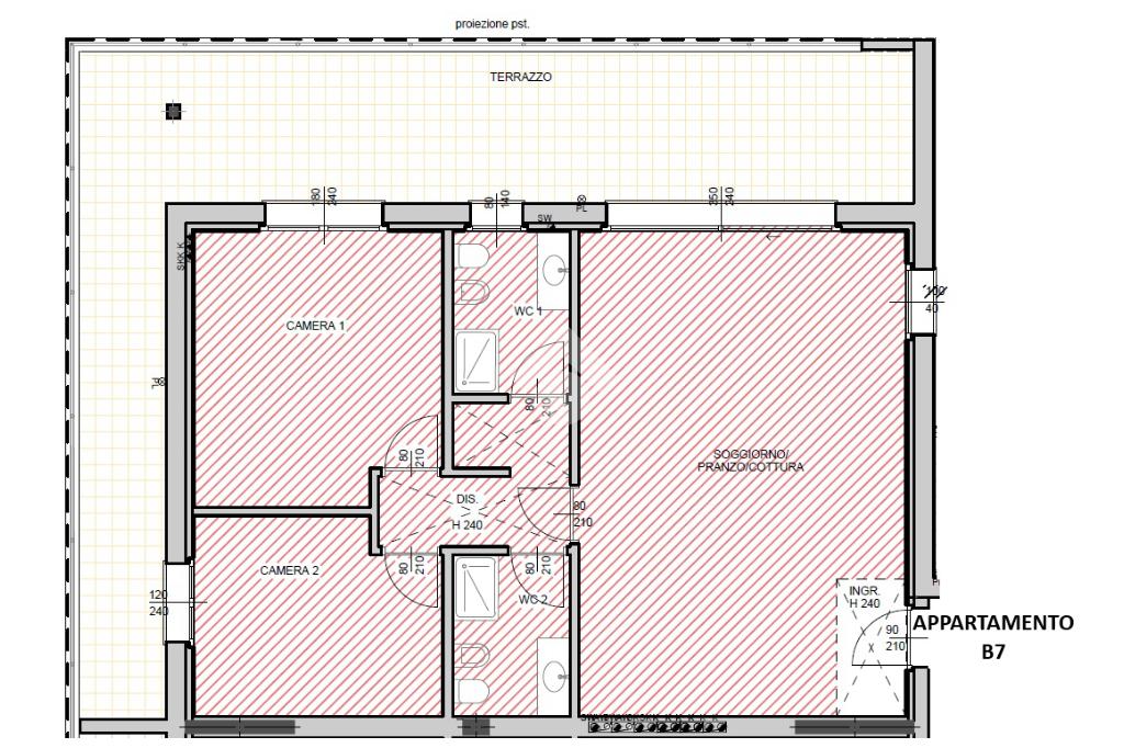 L’Appartamento 7B, trilocale di circa 112 mq posto al secondo piano della Scala B, con esposizione sud-ovest, si distingue per l’ampiezza degli spazi e la luminosità naturale che avvolge ogni ambiente.