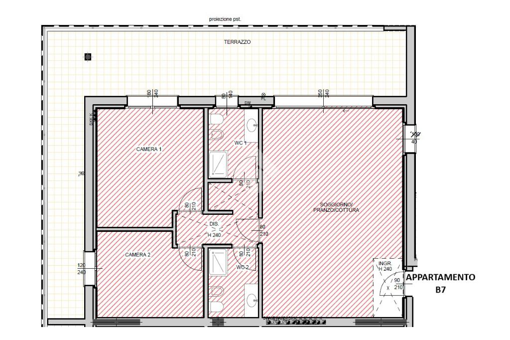 L’Appartamento 7B, trilocale di circa 112 mq, posto al secondo piano della Scala B, con esposizione sud-ovest, si distingue per l’ampiezza degli spazi e la luminosità naturale che avvolge ogni ambiente.