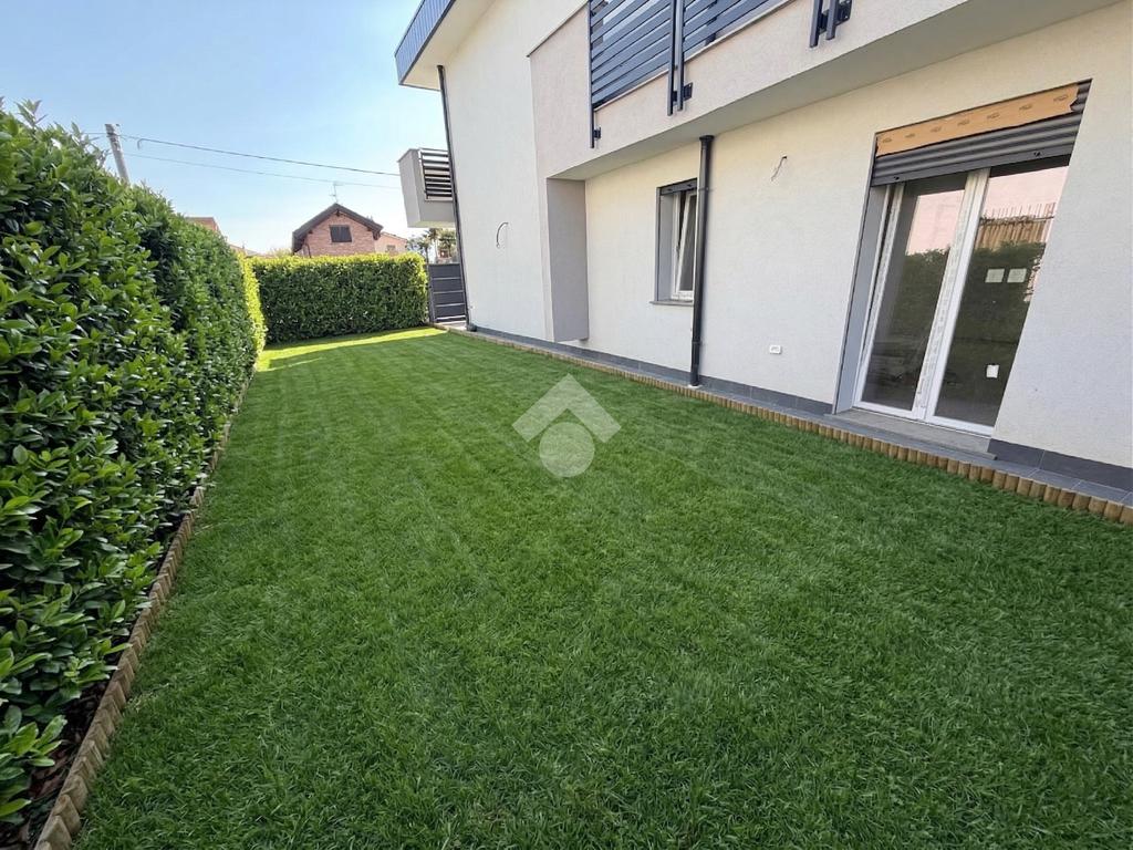 Al piano terra troviamo la zona living con cucina a vista, caratterizzata da accesso diretto al giardino privato di circa 170 mq disposto su tre lati, perfetto per momenti di relax e convivialità, oltre a un bagno finestrato di servizio.